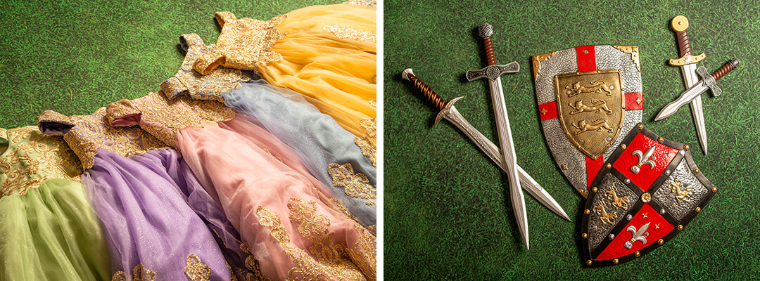 Complete your enchanted photoshoot with whimsical props, including plush unicorns and dragons, royal jewelry, toy stick ponies, knight swords, shields, and more.